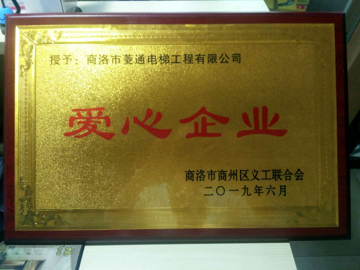 商洛市義工聯合會2019年6月,授予:商洛市菱通電梯工程有限公司愛心企業(yè)獎