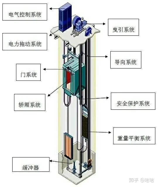 七、電氣控制系統(tǒng):電梯的電氣控制系統(tǒng)由控制裝置,操縱裝置,平層裝置,和位置顯示裝置等部分組成。其中控制裝置根據(jù)電梯的運(yùn)行邏輯功能要求,控制電梯的運(yùn)行,設(shè)置在機(jī)房中的控制柜上。操縱裝置是由轎廂內(nèi)的按鈕箱和廳門的召喚箱按鈕來操縱電梯的運(yùn)行的。平層裝置是發(fā)出平層控制信號(hào),使電梯轎廂準(zhǔn)確平層的控制裝置。所謂平層,是指轎廂在接近某一樓層的??空緯r(shí),欲使轎廂地坎與廳門地坎達(dá)到同一平面的操作。位置顯示裝置是用來顯示電梯所在樓層位置的轎內(nèi)和廳門的指示燈,廳門指示燈還用尖頭指示電梯的運(yùn)行方向。